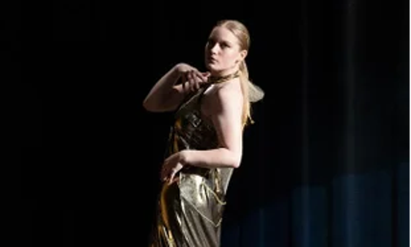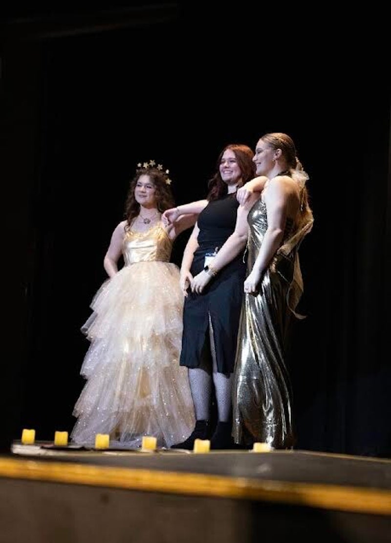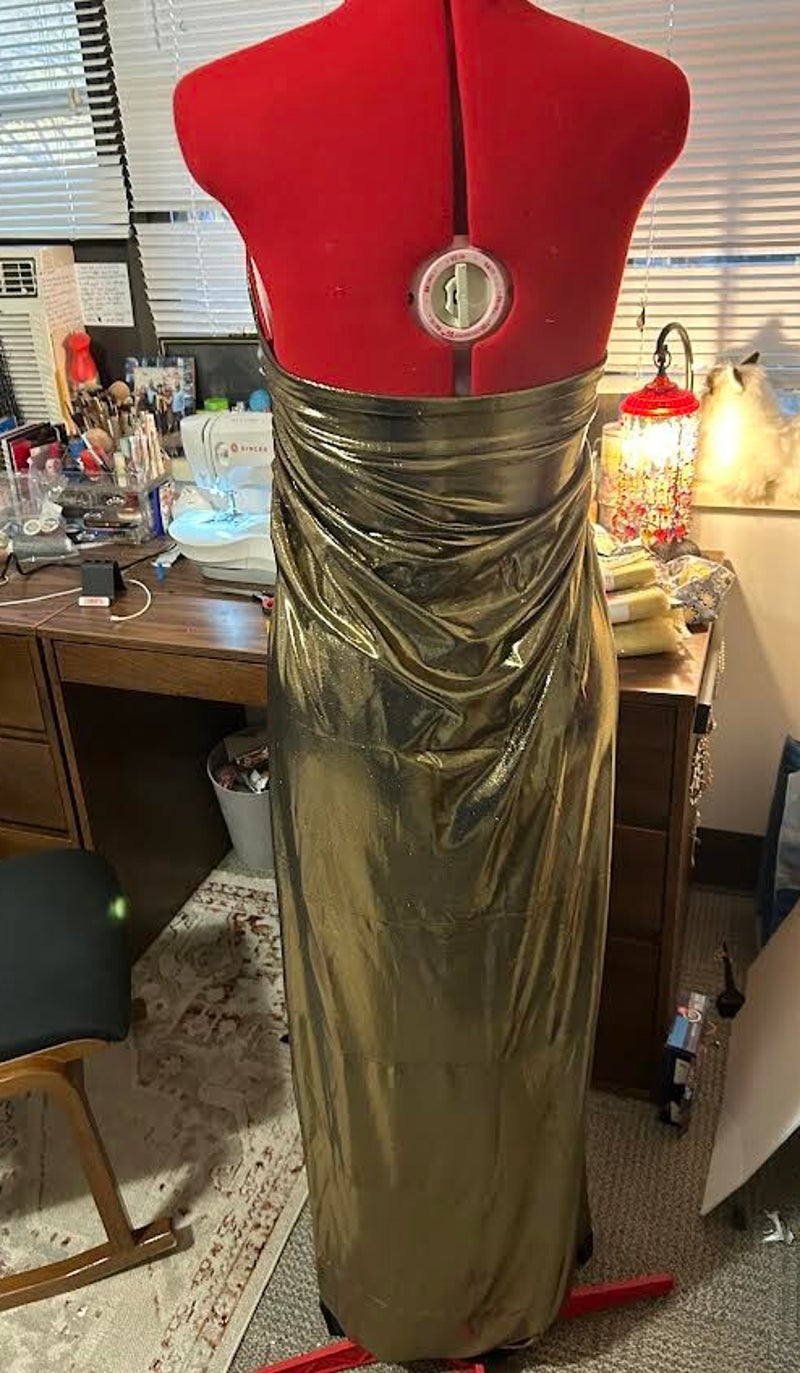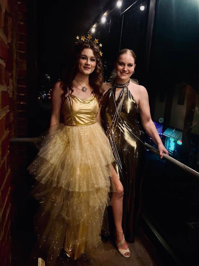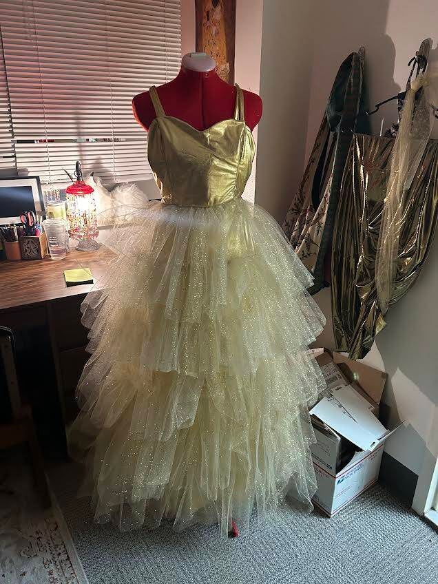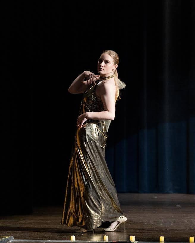 I started by drafting a rough bodice, planning for adjustable garments through a lace up back and the use of stretchy material. After playing around with the neckline of the darker dress, I decided on a higher halter neck to give a more elongated appearance. Then going back to the lighter dress, I became to measure out and gather the ruffles to make a fluffy, full skirt without an underskirt. Once the bases of the dresses were made, we did a quick fitting then got to work adding the details. I used gold sequins, chains and broaches to mimic the night sky. In addition, I referenced my inspiration board to create matching accessories- both jewelry and hair. With one final dress rehearsal, we were ready for the show!