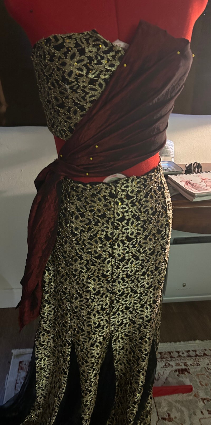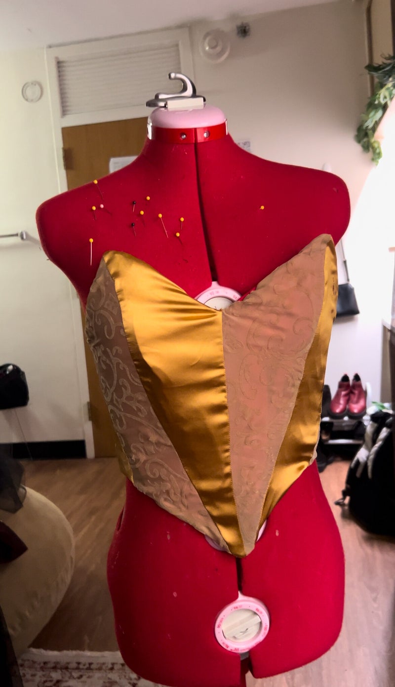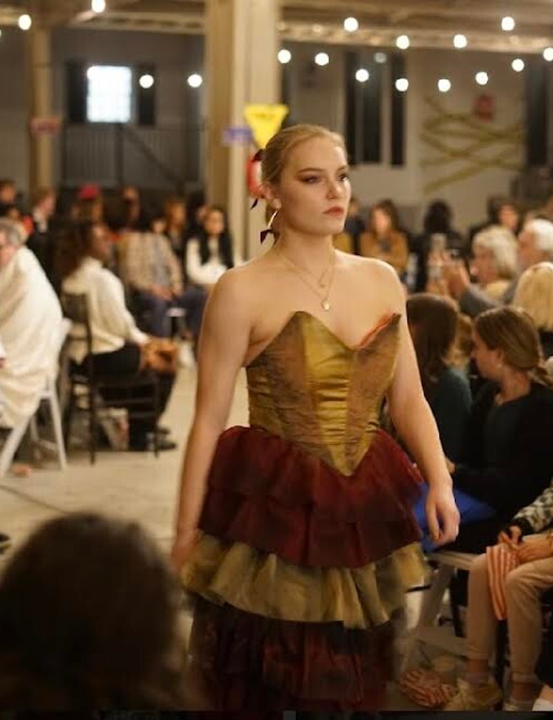 I also took extra care to add intricate details, like hand-glued rhinestones and fully boned corsetry, to elevate the designs and give them a sense of refinement despite their raw aesthetic. For the finishing touches, I prepped accessories like shredded ribbons for hair ties, adding a playful and slightly chaotic element to the looks. With everything complete, the garments were ready to be unveiled—perfectly imperfect, full of personality, and ready to transport the audience to a world of roadside wonder.