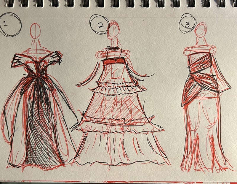 The process of creating these dresses was a journey of both challenge and creativity. Initially, my designs were based on bold, sweeping sketches inspired by the circus tent’s iconic stripes and the whimsical nature of the funhouse. However, as the project progressed, I encountered some unexpected challenges that pushed me to think outside the box. A shortage of fabric meant I had to get creative with my cuts and designs, adjusting proportions and finding innovative ways to work within limited materials. Additionally, ensuring the garments fit each model properly was a constant hurdle, so I focused on creating adjustable sizing features that would accommodate the models’ different body types, while still maintaining the integrity of the design.