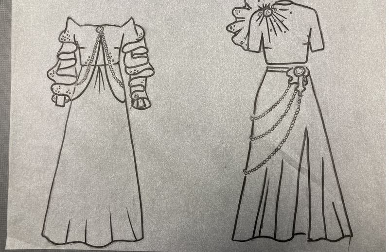 Design one is inspired by the top, left corner of the painting, which depicts a bright, gold ceiling, wall, and chandelier. I drew inspirations from the long, rectangular shapes of the columns and the shiny gold color to create this garment. After adjusting my mannequin to the correct measurements, I draped the fabric and played around with the pleats until I found a shape that i liked. I was able to form the V shape in the seams that mimics the dress in the painting. I created the sleeves by wrapping pleated paper around a sleeve then connecting that to a piece of the original fabric, to create the curved neckline. At this point, I sketched a few more designs to fix the problems I was having. I came up with a few more designs where I then settled for no slit and instead add more fabric in the back of the dress to allow movement. I also decided to add a cape to give an extra element of fun and excitement to the dress.