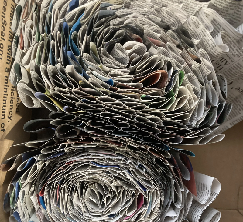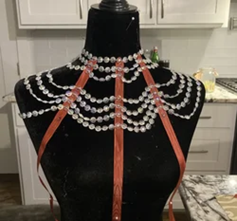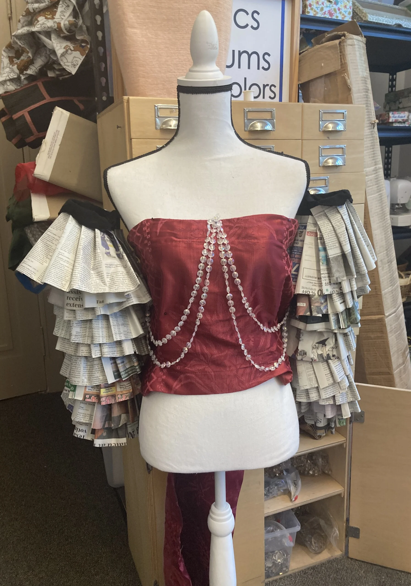 This dress was the only one that required a pattern, after I had trouble lining up the front pieces and the neck piece from my drafts. Using a thick curtain, I created the top of this garment then connected it to a muslin skirt that would be covered with newspaper. Later, a slit would be cut into the skirt to make it easier to walk in for the model. I then switched focuses and started making the main accessory for this garment, the chest piece. Using a mannequin and some ribbon, I drew out the shape I wanted to make. Then I used the crystal beads and paper beads to fill in the spaces to make a draping effect.
