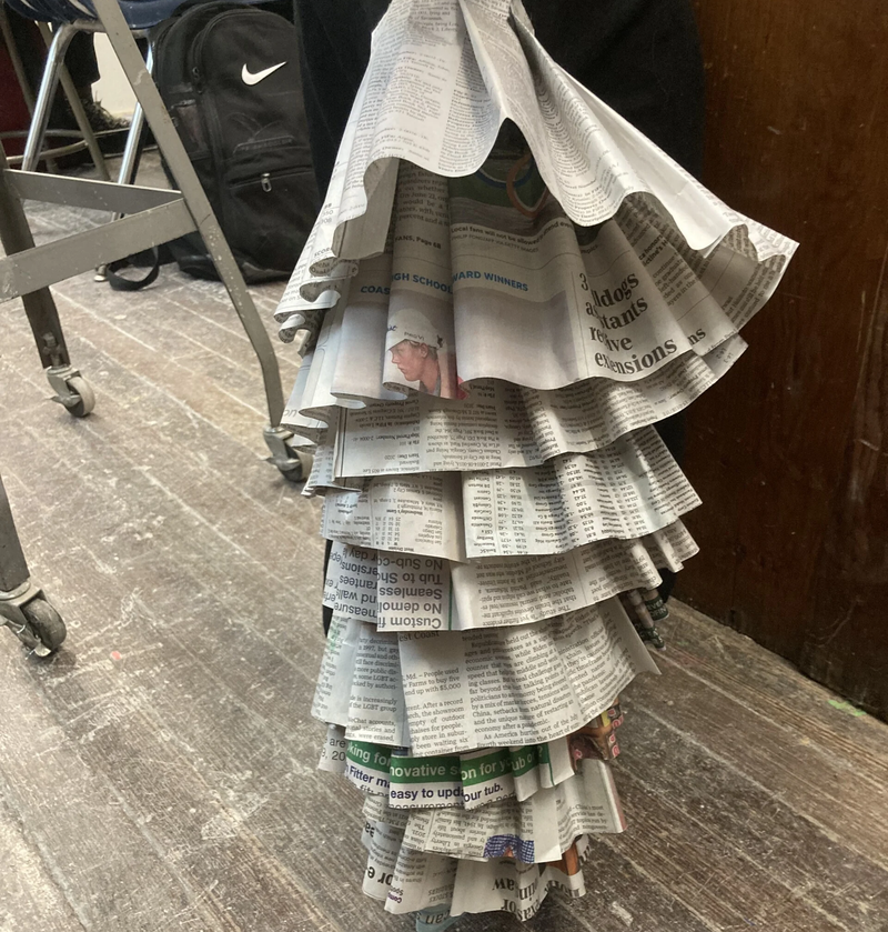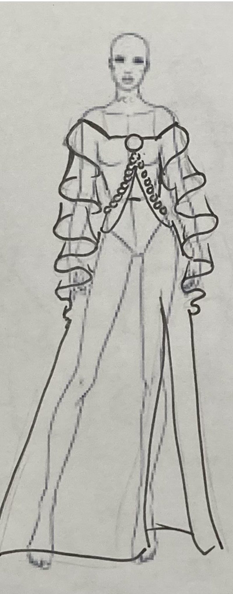 Design two draws inspiration from the main focus of the painting, the women depicted in the center. This dress is meant to mimic her own dress, but in a more modern and junk 2 funk style. I started by drafting a pattern of the desired shape, then used those pieces to alter and refine the details of the pattern to fit the model. From there I crafted the top of the dress out of a stretchy material and finished adding the paper ruffles to the skirt. Lastly, i added the shoulder ruffles and tulle as depicted in the sketch of the design.