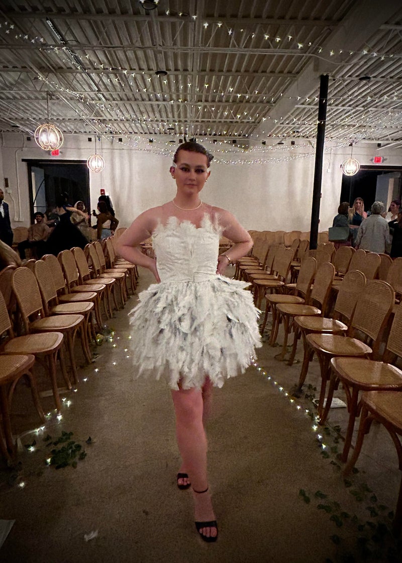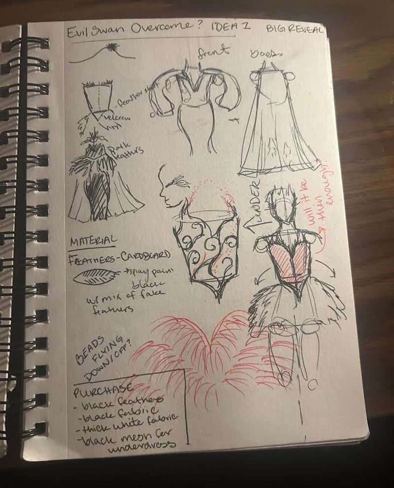 To start the swan inspired dress, I did a lot of research on transformation dresses, and decided to use the method that Cinderella uses in live shows. To begin, I made a simple, tube style black dress out of a stretchy fabric, then added two layers of tulle, one black and one white (mostly for my own organization). Then, hours were spent individually gluing black craft feathers to one side of the black tulle. Then the dress was turned inside out and white craft feathers were glued on the white tulle in the opposite direction. For the show, the black skirt will be rolled up and help up by the white skirt, which is held up by a simple white corset with Velcro in the center. A mural was painted on the back of the corset to depict the transformation in pictures. More decorative feathers were added, the reveal was tested multiple times, weights were added to the skirt, then it was done.