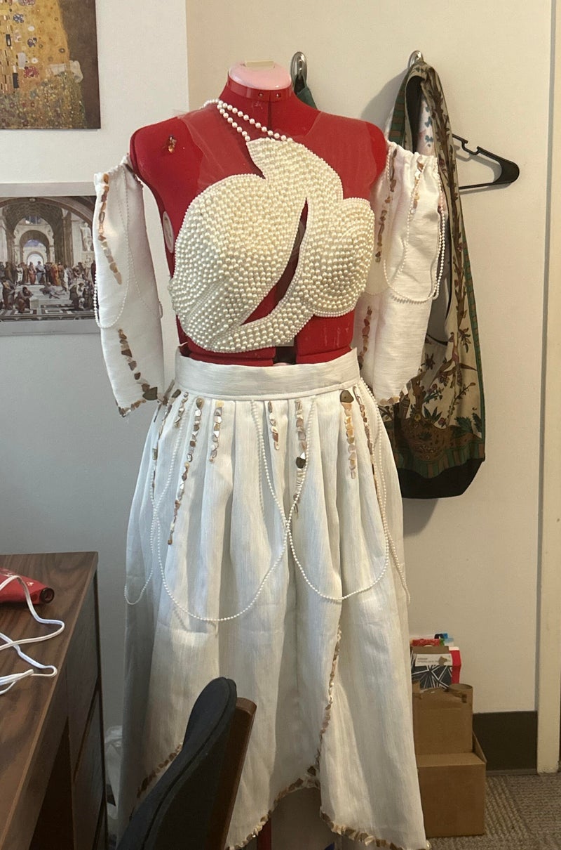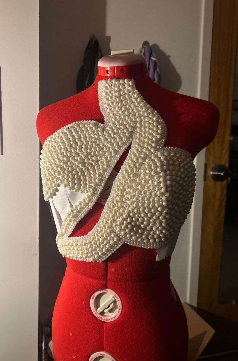 To start the mermaid inspired dress, I created a paper bodice, molded to a mannequin's shape. Then, in a swirl pattern, I attached strings of pearls. I added a mesh mterial to the back of the bodice for support as well as decorative strings of pearls. Lastly, for the bodice, i added mosaic tiles to the edges to outline the shape. This outfit also has a high-low skirt that was made from old curtains. A scalloped edge was put in place to reference shells, as well with lines on the skirt made from the mosaic tiles and shell mix. the sleeves were made in a similar fashion to match the skirt. Strings of different kinds of shells were used as accessories for this look.
